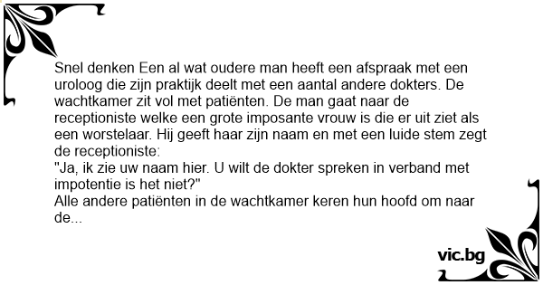 Snel denken Een al wat oudere man heeft een afspraak met een uroloog die zijn praktijk deelt met een aantal andere dokters. De wachtkamer zit vol met patiënten. De man gaat naar de receptioniste welke een grote imposante vrouw is die er uit ziet als een worstelaar. Hij geeft haar zijn naam en met een luide stem zegt de receptioniste: