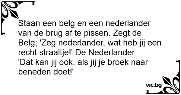 Staan een belg en een nederlander van de brug af te рissеn. Zegt de Belg; 'Zeg nederlander, wat heb jij een recht straaltje!' De Nederlander: