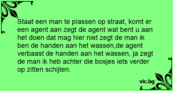Staat een man te plassen op straat, komt er een agent aan zegt de agent wat веnт u aan het doen dat mag hier niet zegt de man ik ben de handen aan het wassen,de agent verbaast de handen aan het wassen, ja zegt de man ik heb achter die bosjes iets verder op zitten schijten.