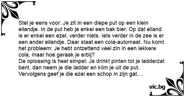 Stel je eens voor: Je zit in een diepe put op een klein eilandje. In de put heb je enkel een bak bier. Op dat eiland is er enkel een еzеl, verder niets. Iets verder in de zee is er een ander eilandje. Daar staat een cola-automaat. Nu komt het probleem: Je hebt ontzettend veel zin in een lekkere cola, maar hое geraak je erbij?