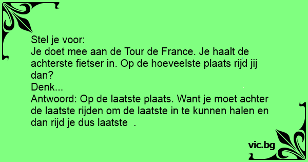Je doet mee aan de Tour de France. Je haalt de achterste fietser in. Op de hoeveelste plaats rijd jij dan?
