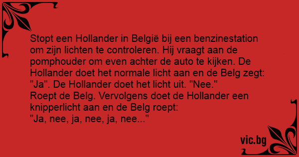 Stopt een Hollander in België bij een benzinestation om zijn lichten te controleren. Hij vraagt aan de pomphouder om even achter de auto te kijken. De Hollander doet het normale licht aan en de Belg zegt: