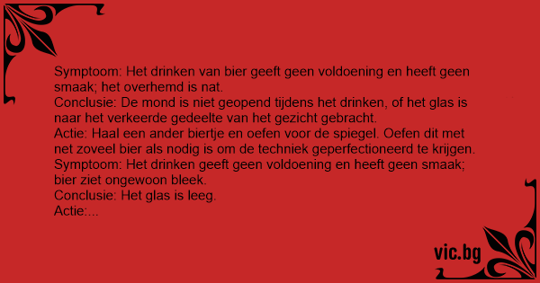 Symptoom: Het drinken van bier geeft geen voldoening en heeft geen smaak; het overhemd is nat.