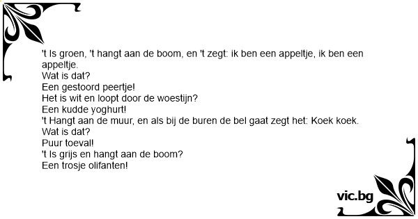 't Is groen, 't hangt aan de boom, en 't zegt: ik ben een appeltje, ik ben een appeltje.