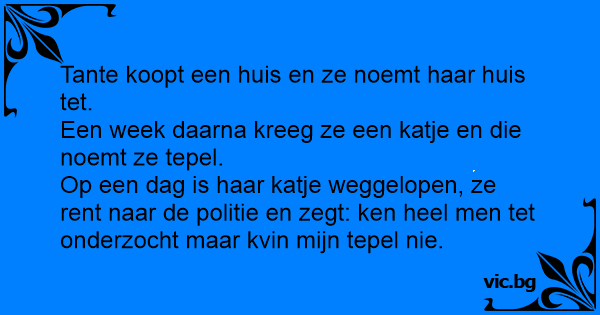 Tante koopt een huis en ze noemt haar huis tet.<br />Een week daarna kreeg ze een katje en die noemt ze tepel.<br />Op een dag is haar katje weggelopen, ze rent naar de politie en zegt: ken heel men tet onderzocht maar kvin mijn tepel nie.