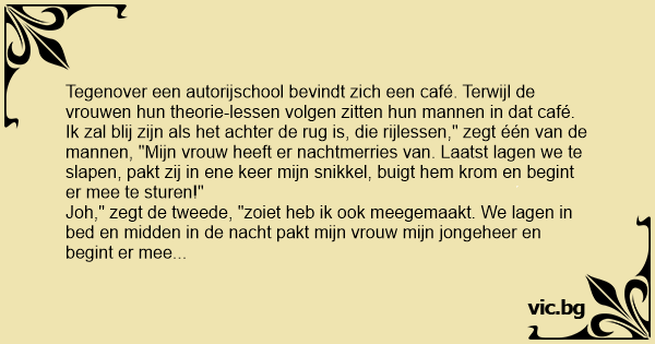 Joh," zegt de tweede, "zoiet heb ik ook meegemaakt. We lagen in bed en midden in de nacht pakt mijn vrouw mijn jongeheer en begint er mee te schakelen: 1,2,3,in zijn 4, enzovoort."