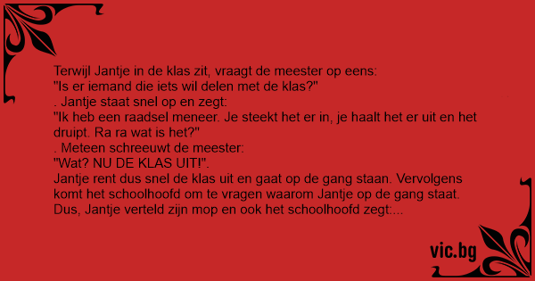 Jantje rent dus snel de klas uit en gaat op de gang staan. Vervolgens komt het schoolhoofd om te vragen waarom Jantje op de gang staat. Dus, Jantje verteld zijn mop en ook het schoolhoofd zegt: