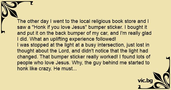 The other day I went to the local religious book store and I saw a "Honk if you love Jesus" bumper sticker. I bought it and put it on the back bumper of my car, and I'm really glad I did. What an uplifting experience followed!