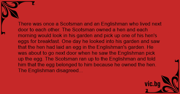 There was once a Scotsman and an Englishman who lived next door to each other. The Scotsman owned a hen and each morning would look in his garden and pick up one of his hen's eggs for breakfast. One day he looked into his garden and saw that the hen had laid an egg in the Englishman's garden. He was about to go next door when he saw the Englishman pick up the egg. The Scotsman ran up to the Englishman and told him that the egg belonged to him because he owned the hen. The Englishman disagreed because the egg was laid on his property.