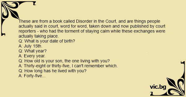 These are from a book called Disorder in the Court, and are things people actually said in court, word for word, taken down and now published by court reporters - who had the torment of staying calm while these exchanges were actually taking place. Q: What is your date of birth? A: July 15th. Q: What year? A: Every year. Q: How old is your son, the one living with you? A: Thirty-eight or thirty-five, I can't remember which. Q: How long has he lived with you? A: Forty-five years. - ________________________________________________ Q: What was the first thing your husband said to you when he woke up that morning? A: He said, "Where am I, Cathy?" Q: And why did that upset you? A: My name is Susan. - ________________________________________________ Q: How was your first marriage terminated? A: By death. - ________________________________________________ Q: Is your appearance here this morning pursuant to a deposition notice which I sent to your attorney? A: No, this is how I dress when I go to work. - ________________________________________________ Q: Doctor, before you performed the autopsy, did you check for a pulse? A: No. Q: Did you check for blood pressure? A: No. Q: Did you check for breathing? A: No. Q: So, then it is possible that the patient was alive when you began the autopsy? A: No. Q: How can you be so sure, Doctor? A: Because his brain was sitting on my desk in a jar. Q: But could the patient have still been alive, nevertheless? A: Yes, it is possible that he could have been alive and practicing law.