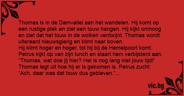 Petrus begint het wat beu te worden. Hij zou liever in alle rust van zijn vieruurtje genieten. Hij doet Thomas een voorstel.