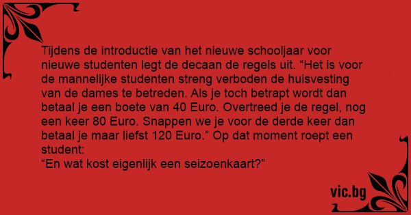Tijdens de introductie van het nieuwe schooljaar voor nieuwe studenten legt de decaan de regels uit. “Het is voor de mannelijke studenten streng verboden de huisvesting van de dames te betreden. Als je toch betrapt wordt dan betaal je een boete van 40 Euro. Overtreed je de regel, nog een keer 80 Euro. Snappen we je voor de derde keer dan betaal je maar liefst 120 Euro.” Op dat moment roept een student: