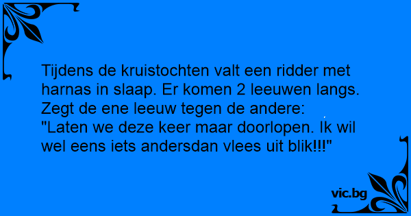 Tijdens de kruistochten valt een ridder met harnas in slaap. Er komen 2 leeuwen langs. Zegt de ene leeuw tegen de andere: