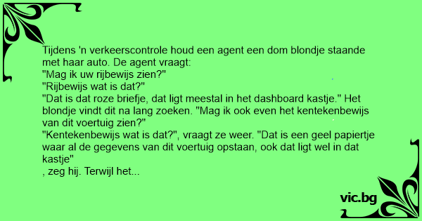 Tijdens 'n verkeerscontrole houd een agent een dom blondje staande met haar auto. De agent vraagt: