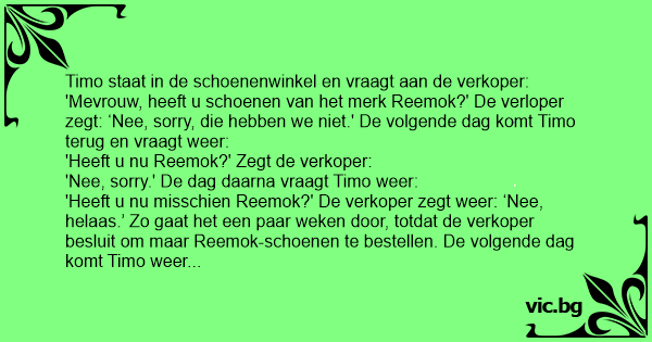 'Heeft u nu misschien Reemok?' De verkoper zegt weer: ‘Nee, helaas.’ Zo gaat het een paar weken door, totdat de verkoper besluit om maar Reemok-schoenen te bestellen. De volgende dag komt Timo weer langs. Als hij aan de verkoper vraagt of ze ook Reemok heeft, zegt ze blij: ‘Ja, die heb ik!’ Waarop Timo zegt: ‘Lelijk, hè?’