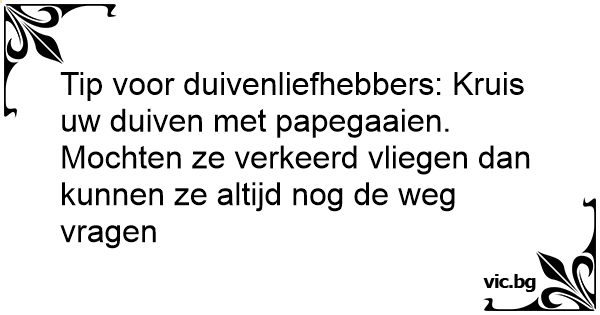 Tip voor duivenliefhebbers: Kruis uw duiven met papegaaien. Mochten ze verkeerd vliegen dan kunnen ze altijd nog de weg vragen
