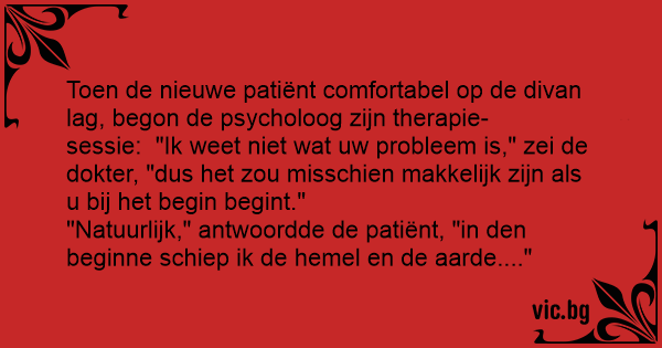 "Natuurlijk," antwoordde de patiënt, "in den beginne schiep ik de hemel en de aarde...."