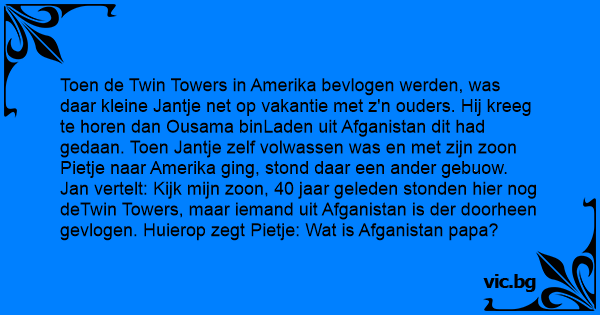 Toen de Twin Towers in Amerika bevlogen werden, was daar kleine Jantje net op vakantie met z'n ouders. Hij kreeg te horen dan Ousama binLaden uit Afganistan dit had gedaan. Toen Jantje zelf volwassen was en met zijn zoon Pietje naar Amerika ging, stond daar een ander gebuow. Jan vertelt: Kijk mijn zoon, 40 jaar geleden stonden hier nog deTwin Towers, maar iemand uit Afganistan is der doorheen gevlogen. Huierop zegt Pietje: Wat is Afganistan papa?