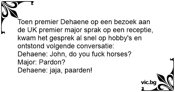 Toen premier Dehaene op een bezoek aan de UK premier major sprak op een receptie, kwam het gesprek al snel op hobby's en ontstond volgende conversatie: