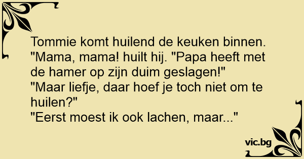 Tommie komt huilend de keuken binnen. "Mama, mama! huilt hij. "Papa heeft met de hamer op zijn duim geslagen!"