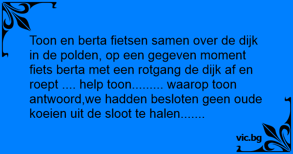 Toon en berta fietsen samen over de dijk in de polden, op een gegeven moment fiets berta met een rotgang de dijk af en roept .... help toon......... waarop toon antwoord,we hadden besloten geen oude koeien uit de sloot te halen.......