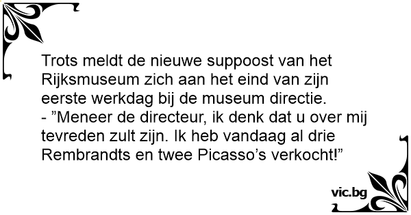 Trots meldt de nieuwe suppoost van het Rijksmuseum zich aan het eind van zijn eerste werkdag bij de museum directie.<br />- ”Meneer de directeur, ik denk dat u over mij tevreden zult zijn. Ik heb vandaag al drie Rembrandts en twee Picasso’s verkocht!”
