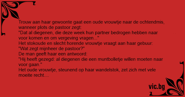 Trouw aan haar gewoonte gaat een oude vrouwtje naar de ochtendmis, wanneer plots de pastoor zegt: