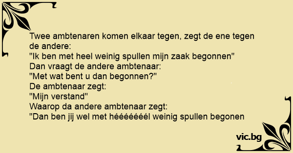 Twee ambtenaren komen elkaar tegen, zegt de ene tegen de andere: