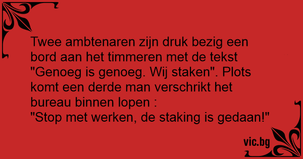 Twee ambtenaren zijn druk bezig een bord aan het timmeren met de tekst "Genoeg is genoeg. Wij staken". Plots komt een derde man verschrikt het bureau binnen lopen :