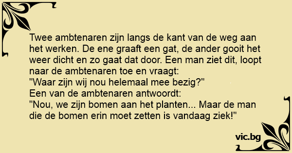 Twee ambtenaren zijn langs de kant van de weg aan het werken. De ene graaft een gat, de ander gooit het weer dicht en zo gaat dat door. Een man ziet dit, loopt naar de ambtenaren toe en vraagt: