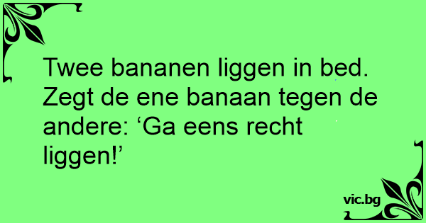 Twee bananen liggen in bed.<br />Zegt de ene banaan tegen de andere: ‘Ga eens recht liggen!’