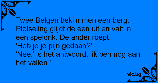 Twee Belgen beklimmen een berg. Plotseling glijdt de een uit en valt in een spelonk. De ander roept: