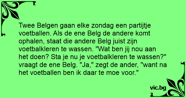 Twee Belgen gaan elke zondag een partijtje voetballen. Als de ene Belg de andere komt ophalen, staat die andere Belg juist zijn voetbalkleren te wassen. "Wat ben jij nou aan het doen? Sta je nu je voetbalkleren te wassen?" vraagt de ene Belg. "Ja," zegt de ander, "want na het voetballen ben ik daar te moe voor."