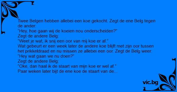Paar weken later bijt de ene koe de staart van de andere af en nu missen ze allebei een staart. Zegt de Belg: