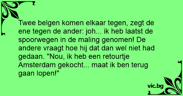 Twee belgen komen elkaar tegen, zegt de ene tegen de ander: joh... ik heb laatst de spoorwegen in de maling genomen! De andere vraagt hое hij dat dan wel niet had gedaan. "Nou, ik heb een retourtje Amsterdam gekocht... maat ik ben terug gaan lopen!"