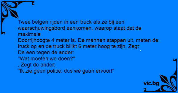 Twee belgen rijden in een truck als ze bij een waarschuwingsbord aankomen, waarop staat dat de maximale