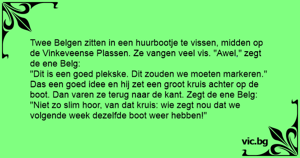 Twee Belgen zitten in een huurbootje te vissen, midden op de Vinkeveense Plassen. Ze vangen veel vis. "Awel," zegt de ene Belg: