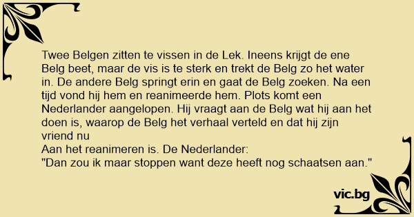 Twee Belgen zitten te vissen in de Lek. Ineens krijgt de ene Belg beet, maar de vis is te sterk en trekt de Belg zo het water in. De andere Belg springt erin en gaat de Belg zoeken. Na een tijd vond hij hem en reanimeerde hem. Plots komt een Nederlander aangelopen. Hij vraagt aan de Belg wat hij aan het doen is, waarop de Belg het verhaal verteld en dat hij zijn vriend nu