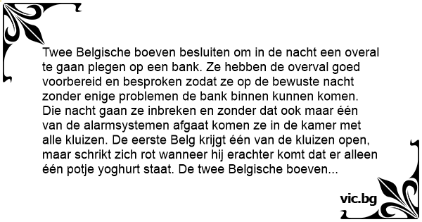 Twee Belgische boeven besluiten om in de nacht een overal te gaan plegen op een bank. Ze hebben de overval goed voorbereid en besproken zodat ze op de bewuste nacht zonder enige problemen de bank binnen kunnen komen. Die nacht gaan ze inbreken en zonder dat ook maar één van de alarmsystemen afgaat komen ze in de kamer met alle kluizen. De eerste Belg krijgt één van de kluizen open, maar schrikt zich rot wanneer hij erachter komt dat er alleen één potje yoghurt staat. De twee Belgische boeven beginnen alle kluizen open te breken en één voor één vinden ze elke keer weer een potje yoghurt. De ene Belg zegt: