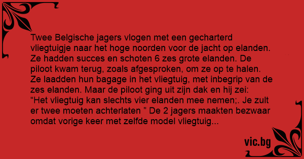 Twee Belgische jagers vlogen met een gecharterd vliegtuigje naar het hoge noorden voor de jacht op elanden. Ze hadden succes en schoten 6 zes grote elanden. De piloot kwam terug, zoals afgesproken, om ze op te halen. Ze laadden hun bagage in het vliegtuig, met inbegrip van de zes elanden. Maar de piloot ging uit zijn dak en hij zei: