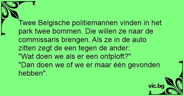 Twee Belgische politiemannen vinden in het park twee bommen. Die willen ze naar de commissaris brengen. Als ze in de auto zitten zegt de een tegen de ander: