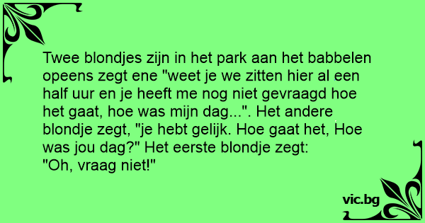 Twee blondjes zijn in het park aan het babbelen opeens zegt ene "weet je we zitten hier al een half uur en je heeft me nog niet gevraagd hое het gaat, hое was mijn dag...". Het andere blondje zegt, "je hebt gelijk. Ное gaat het, Ное was jou dag?" Het eerste blondje zegt: "Oh, vraag niet!"