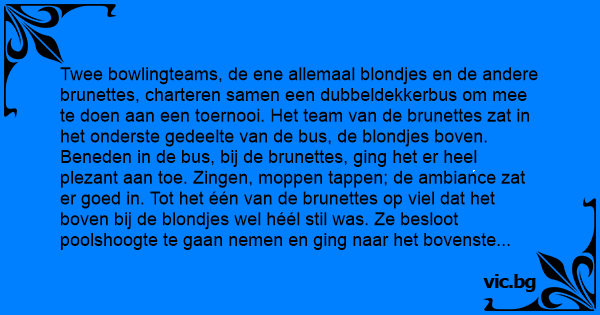 Twee bowlingteams, de ene allemaal blondjes en de andere brunettes, charteren samen een dubbeldekkerbus om mee te doen aan een toernooi. Het team van de brunettes zat in het onderste gedeelte van de bus, de blondjes boven. Beneden in de bus, bij de brunettes, ging het er heel plezant aan toe. Zingen, moppen tappen; de ambiance zat er goed in. Tot het één van de brunettes op viel dat het boven bij de blondjes wel héél stil was. Ze besloot poolshoogte te gaan nemen en ging naar het bovenste gedeelte van de bus. Wanneer ze boven kwam zag ze alle blondjes heel angstig in de stoelen zitten, allemaal met opengesperde ogen rechtdoor starend, de leuning van de zetel voor hun zo hard vastklampend dat hun knokkels er wit van zagen. De brunette vroeg :