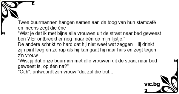 "Wist je dat ik met bijna alle vrouwen uit de straat naar bed geweest ben ? Er ontbreekt er nog maar één op mijn lijstje."
