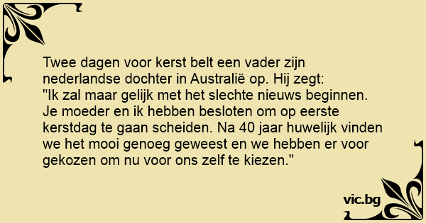 Twee dagen voor kerst belt een vader zijn nederlandse dochter in Australië op. Hij zegt: