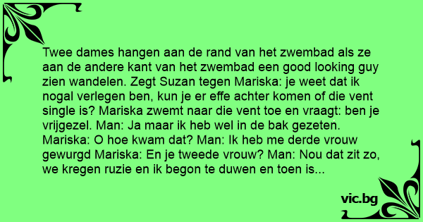 Twee dames hangen aan de rand van het zwembad als ze aan de andere kant van het zwembad een good looking guy zien wandelen. Zegt Suzan tegen Mariska: je weet dat ik nogal verlegen ben, kun je er effe achter komen of die vent single is? Mariska zwemt naar die vent toe en vraagt: ben je vrijgezel. Man: Ja maar ik heb wel in de bak gezeten. Mariska: O hое kwam dat? Man: Ik heb me derde vrouw gewurgd Mariska: En je tweede vrouw? Man: Nou dat zit zo, we kregen ruzie en ik begon te duwen en toen is ze uit het raam gevallen. Mariska: En je eerste vrouw. Man: Die heb ik doodgeschoten. Mariska begint te zwaaien en schreeuwt naar Suzan: Hij is nog vrijgezel !