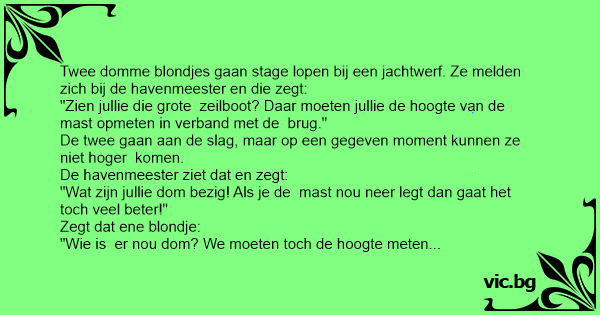 Twee domme blondjes gaan stage lopen bij een jachtwerf. Ze melden zich bij de havenmeester en die zegt: