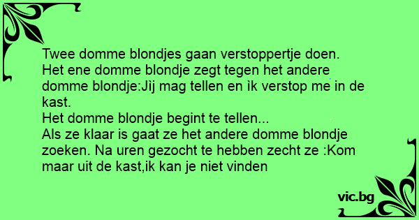 Als ze klaar is gaat ze het andere domme blondje zoeken. Na uren gezocht te hebben zecht ze :Kom maar uit de kast,ik kan je niet vinden