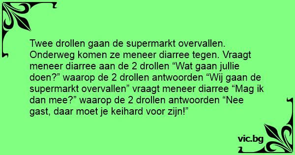 Twee drollen gaan de supermarkt overvallen. Onderweg komen ze meneer diarree tegen. Vraagt meneer diarree aan de 2 drollen “Wat gaan jullie doen?” waarop de 2 drollen antwoorden “Wij gaan de supermarkt overvallen” vraagt meneer diarree “Mag ik dan mee?” waarop de 2 drollen antwoorden “Nee gast, daar moet je keihard voor zijn!”