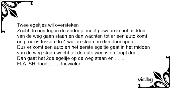 Zecht de een tegen de ander:je moet gewoon in het midden van de weg gaan staan en dan wachten tot er een auto komt en precies tussen de 4 wielen staan en dan doorlopen.